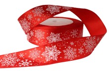 Атласная лента с рисунком "Снежинки" (красный), 25мм * 25 ярдов(+-1м)