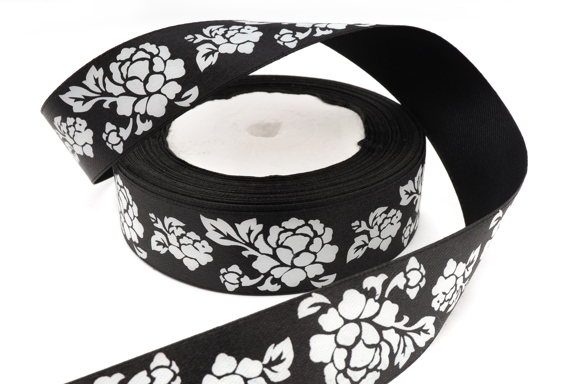 Атласная лента с рисунком "Цветы" (черный), 25мм * 25 ярдов(+-1) всегда найдется у любой мастерицы. Отделка вещей, предметов интерьера, рукоделие, вышивка - это еще не весь спектр применения данной ленты. Четный цвет тайны и неизведанности, строгости и опыта, роскоши и величия будет актуален во все времена.