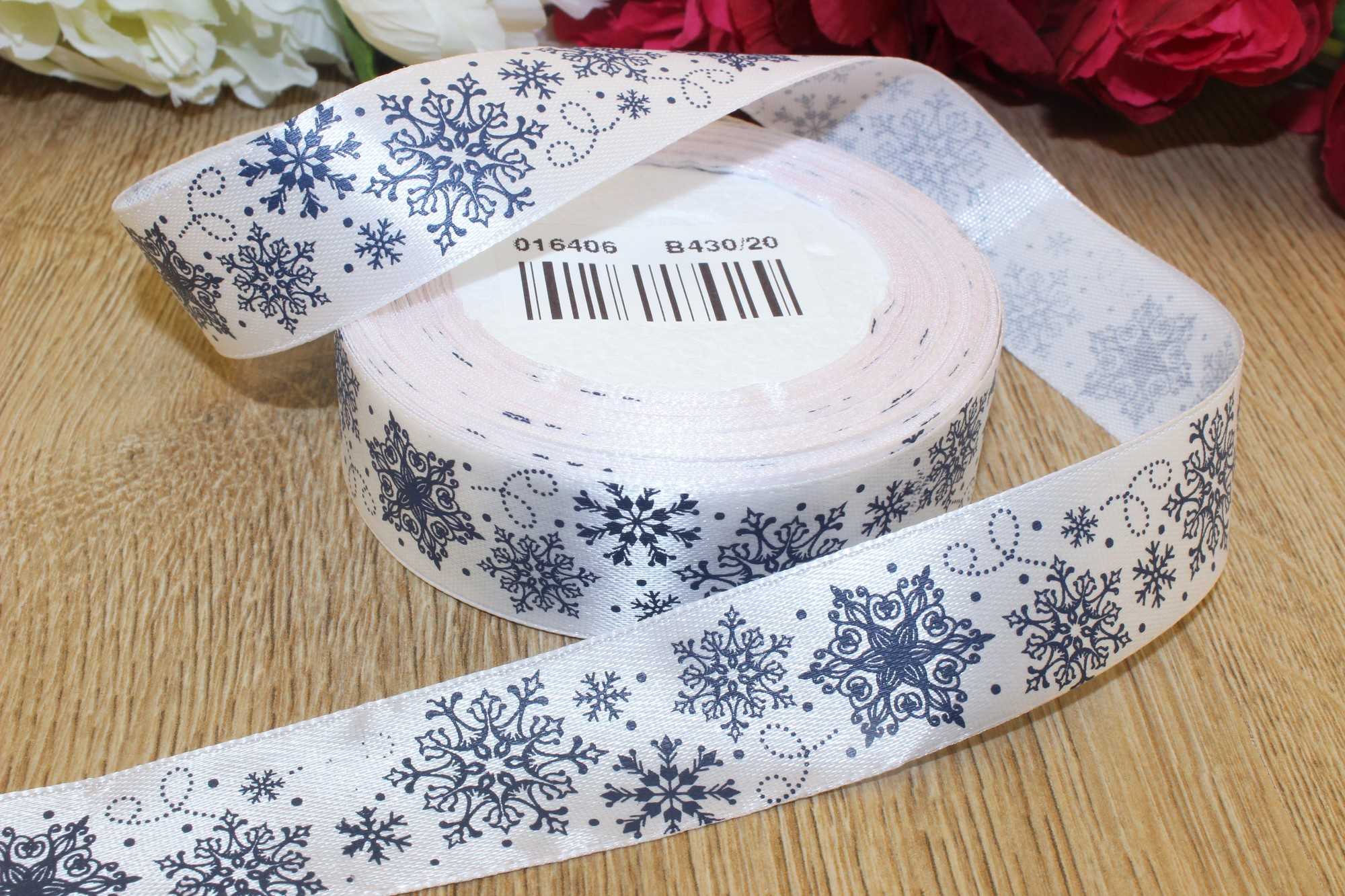 Атласная лента с рисунком "Снежинки" (белый), 25мм * 25 ярдов(+-1м)-гладкая, нежная, приятная на ощупь и радующая глаз, прекрасно подойдет для драпировки одежды и порадует своим качеством при изготовлении оригинальных вещей и рукоделии, а рисунок с новогодней тематикой поможет сделать особенным и незабываемым всеми любимый праздник, создаст особенное настроение и несомненно подарит частичку волшебства в любой дом.