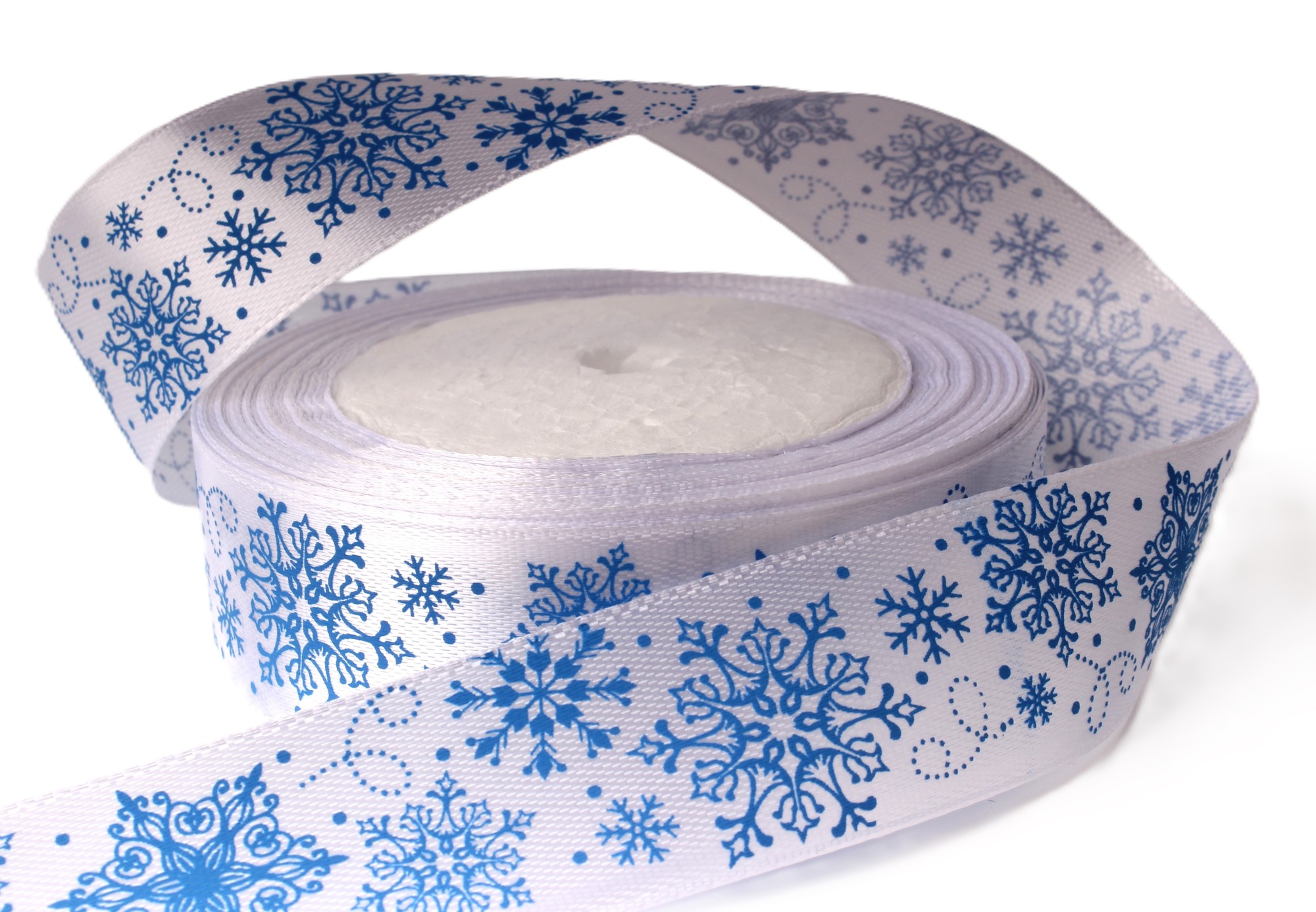 Атласная лента с рисунком "Снежинки" (белый), 25мм * 25 ярдов идеально гладкая и искрящаяся, нежная и женственная, чистая и восхитительная, цвета свежести и чистоты, невинности и непознанности, цвета нового и ранимого. Белая атласная лента идеально подойдет для изящного домашнего текстиля, платьев на особый случай вашей жизни и украшения помещений в любой праздничный день.