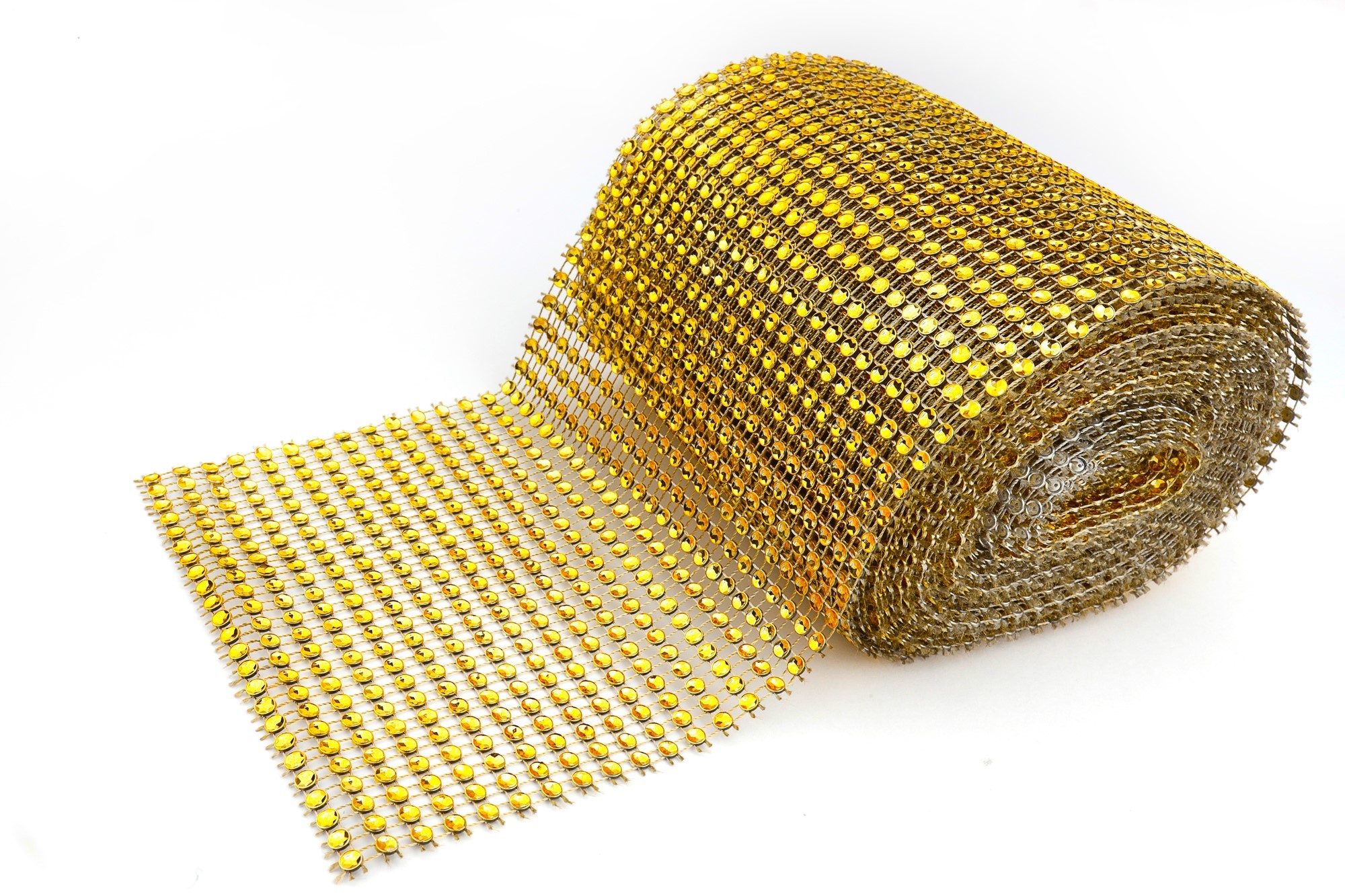 Стразовое полотно имитация (желтое золото), 12см( 24 точки) * 10 ярдов(+-1) имеет массу преимуществ и является просто великолепным помощником для вашего творчества. Полотно очень удобно резать обычными ножницами. Можно вырезать квадраты и круги, овалы, цветы, лепестки, полумесяцы, звезды, полосы разной ширины. Предварительно контур фигуры наносится на обратную сторону полотна. С помощью полотна для страз можно декорировать не только ткань, но и обувь, сумки, ремни, телефоны и даже мебель.