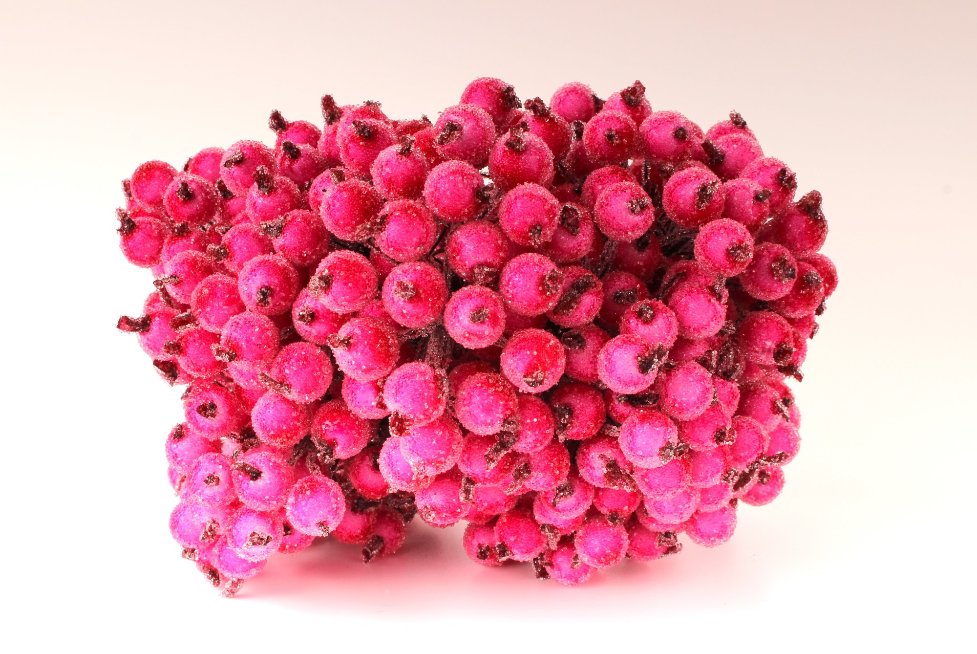 Ягода "в сахаре" (фуксия), 12мм, одна связка 400 ягод может быть применена в декоративных целях, например, вы легко сможете дополнять праздничные композиции, изготавливать праздничную бутафорию, создавать различные украшения для интерьера, волос и одежды. Добавив ягодную нотку в ваше рукоделие, вы несомненно почувствуете летнее и теплое настроение в любое время года.