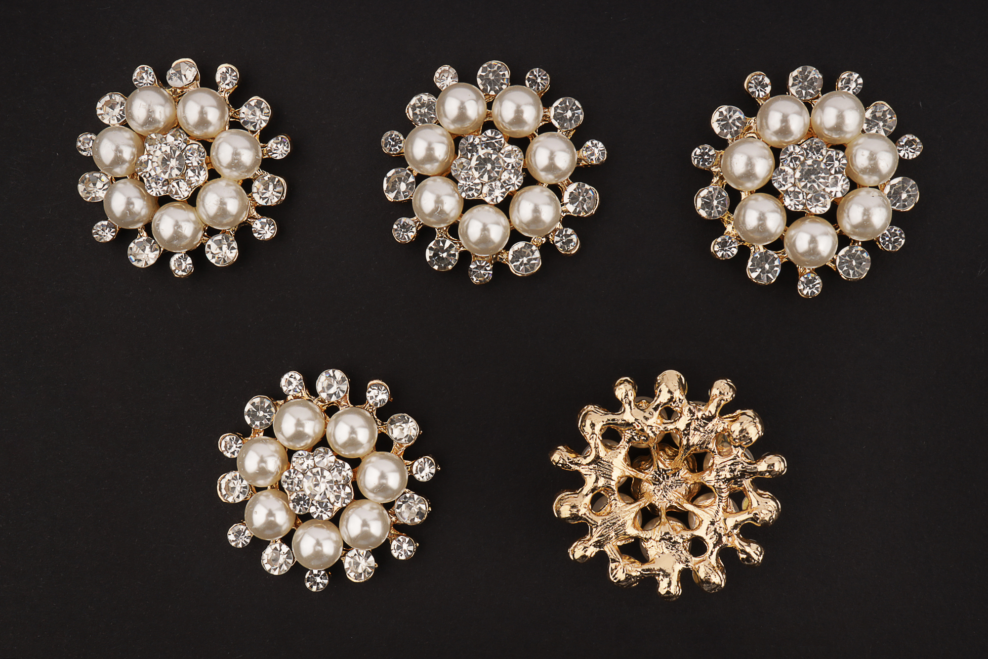 Флоризель металл (золото), d-30мм, упак. 5шт украшены бусинами под жемчуг, стразами. Используются для украшения во флористике, для декорирования, скрапбукинге, свадебной тематике, при изготовлении открыток и альбомов, канзаши, бантиков из лент - украшают серединку, брошей, заколок.