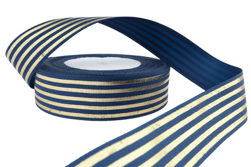 Купить репсовую ленту цвета джинс с рисунком "Полоса" (золото) 25мм * 25 ярдов оптом и в розницу по оптовым ценам с доставкой во все города России можно в нашем интернет-магазине.