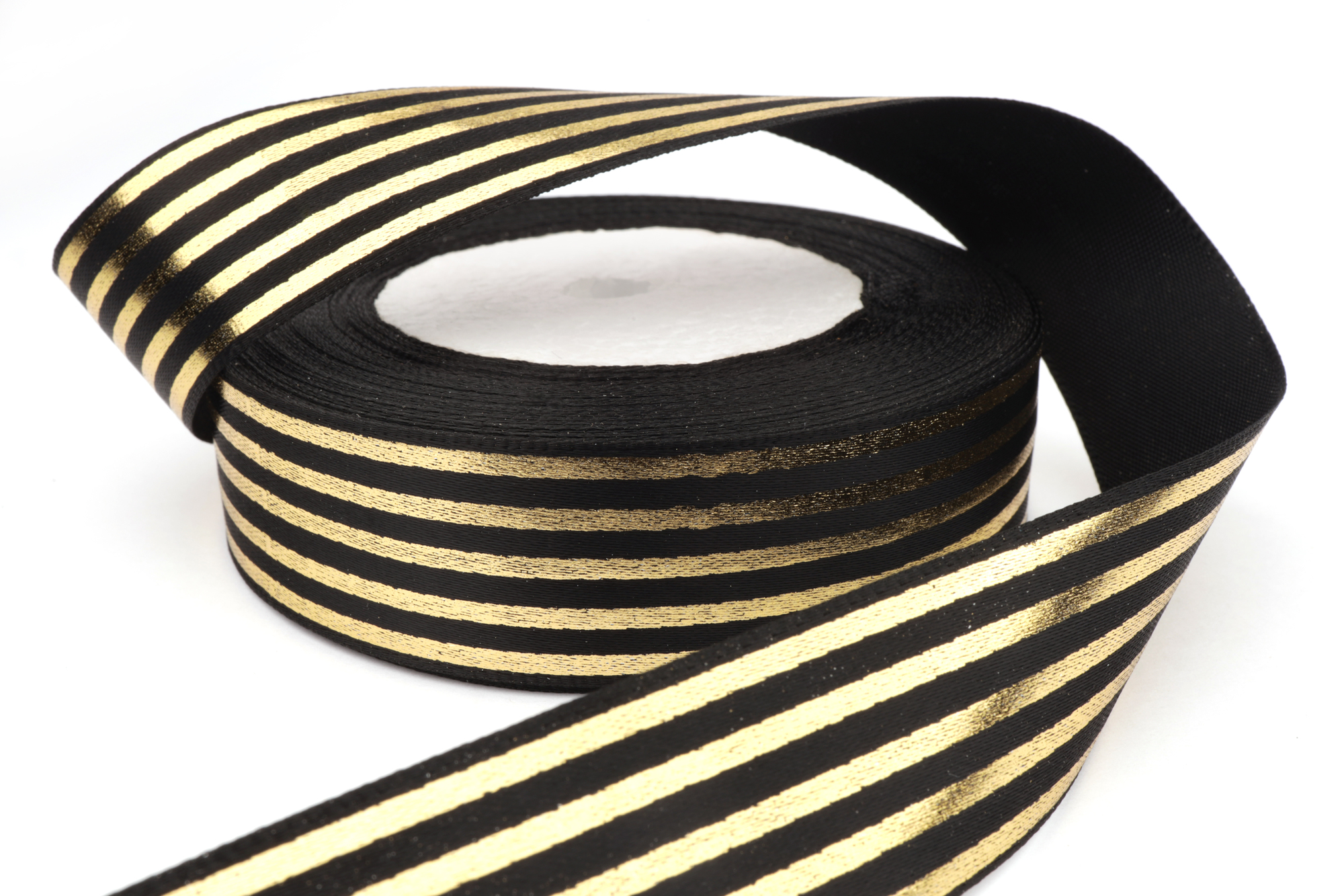 Купить атлусную ленту черного цвета с рисунком "Полоса" (золото) по оптовым ценам с доставкой удобным для вас способом, Вам поможет наш интернет-магазин.