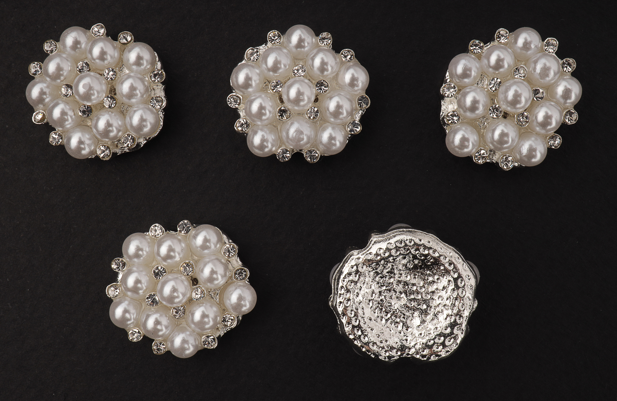 Флоризель металл (серебро), 17мм, упак. 5шт украшены бусинами под жемчуг, стразами. Используются для украшения во флористике, для декорирования, скрапбукинге, свадебной тематике, при изготовлении открыток и альбомов, канзаши, бантиков из лент - украшают серединку, брошей, заколок.