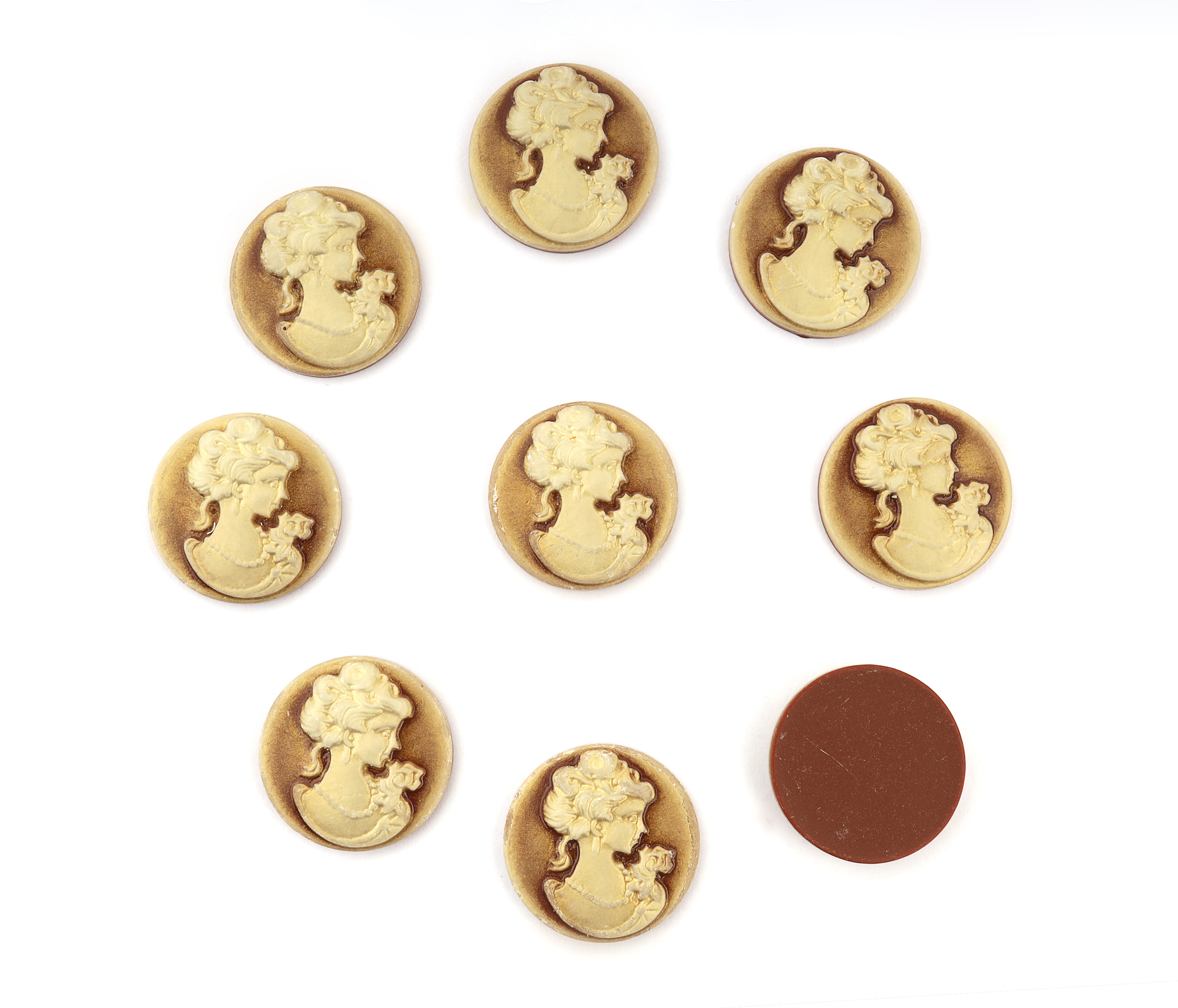 Кабошоны камея акрил (бронза), 25мм, упак.10шт-модный винтажный аксессуар. Его можно сделать центральной деталью образа или дополнить выбранный наряд, создав романтический стиль. Камеи потрясающе красивы, они как хамелеоны, способны преображать и восхищать новыми оттенками стиля и настроения. Сделать украшение с камеей своими руками сейчас не представляется сложным - в продаже разнообразие камей, оправ и отделочных материалов. Попробуйте воплотить свою фантазию в оригинальное украшение, которое может стать изюминкой вашего наряда.