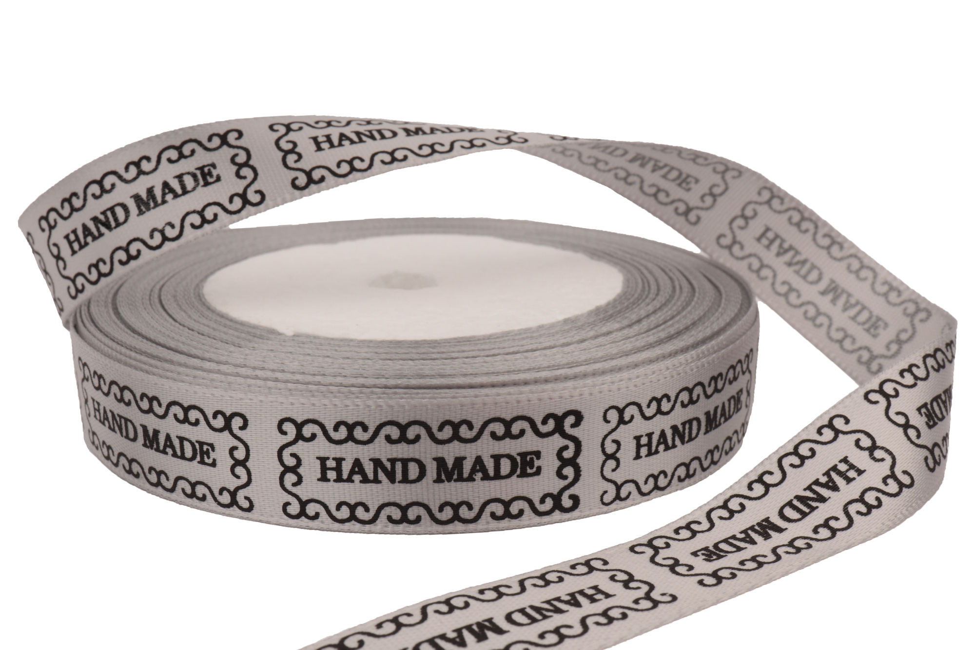 Лента атласная "Hand made" (серый), 15мм * 25ярдов(+-1) используется в качестве маркировки изделий ручной работы наряду с бирками, наклейками и штампами hand-made.