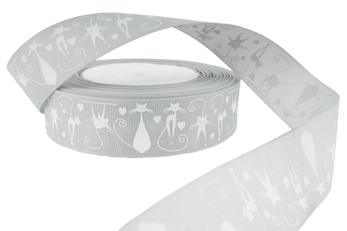 Купить репсовую ленту серого цвета с рисунком "Кошки" 25мм * 25 ярдов (+-1м) оптом и в розницу по оптовым ценам с доставкой во все города России можно в нашем интернет-магазине.