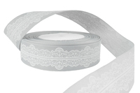 Купить репсовую ленту серого цвета с рисунком "Кружево" оптом и в розницу по оптовым ценам с доставкой во все города России можно в нашем интернет-магазине.