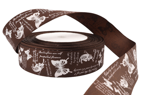 Репсовая лента с рисунком "Бабочки и надписи" (темно-коричневый), 25мм * 25 ярдов (+-1) используются как при производстве текстиля, обуви, мебели, так и при декорировании и отделке различного рода материалов. Вы сможете применить репсовую ленту для украшения открыток, упаковки подарков и товаров, декорирования сумочки, ремня.