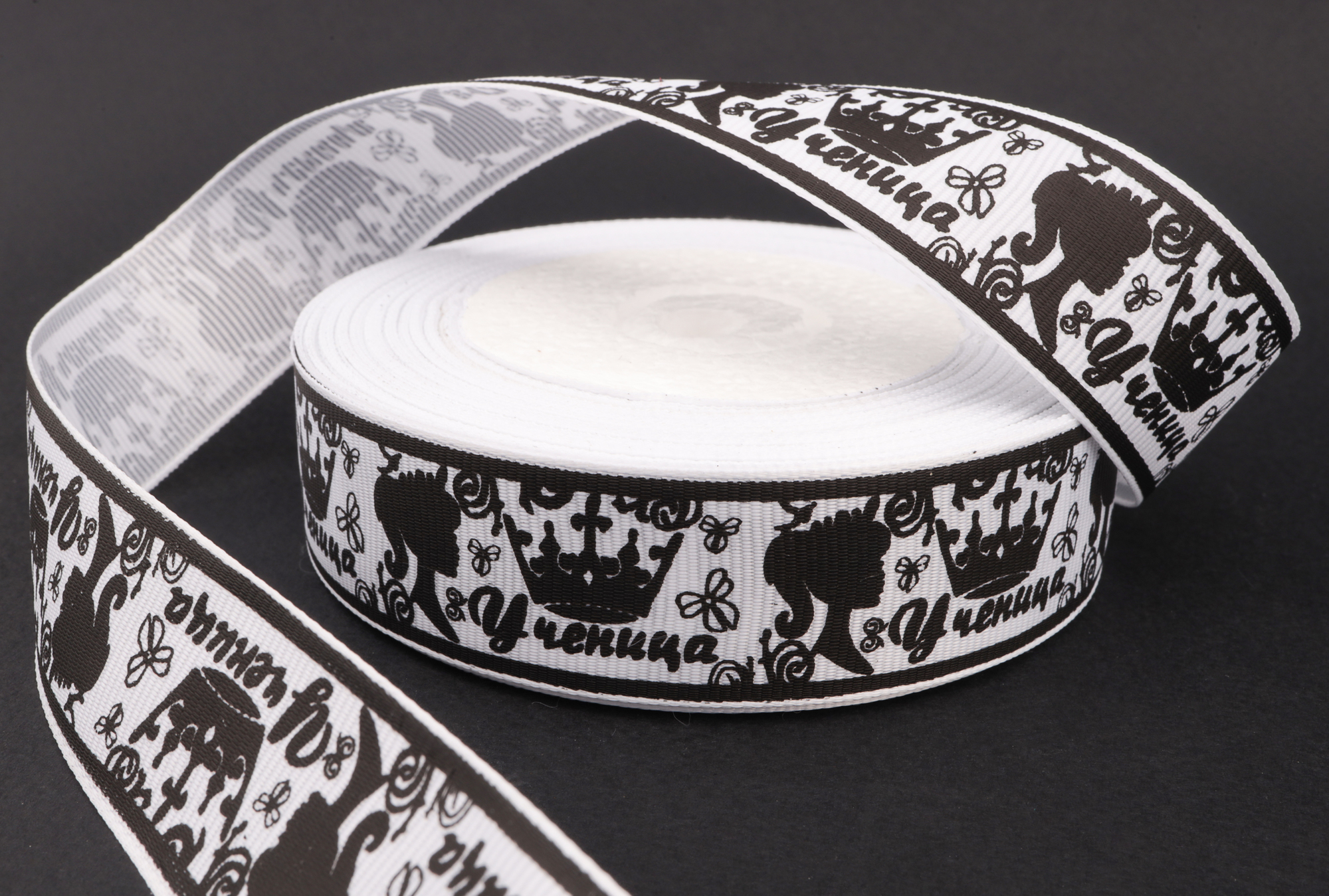 Купить репсовую ленту белого цвета с рисунком "Ученица" оптом и в розницу по оптовым ценам с доставкой во все города России можно в нашем интернет-магазине.