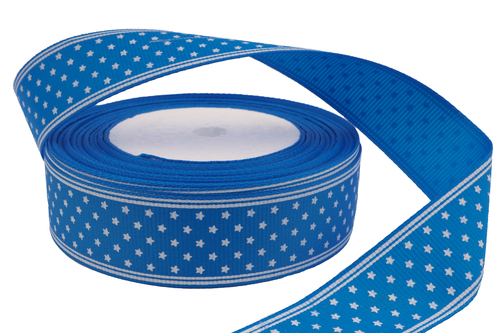 Репсовая лента с рисунком "Звезды" (синий), 25мм * 25 ярдов (+-1) с легкостью украсит любой предмет Вашего творчества, сделав его стильным и красочным. Вы сможете применить репсовую ленту для отделки изделий из плотной ткани или кожи, создать всевозможные предметы декора, банты, заколки, ободки, а также использовать как декоративный элемент в скрапбукинге и кардмэйкинге.